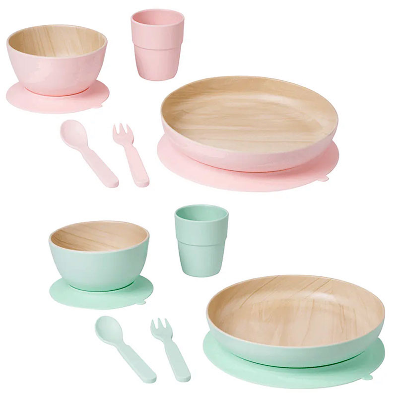 Vajilla de melamina, material muy resistente, duradero y fácil de limpiar. Interior con acabado natural efecto madera que te enamorará. Compuesta por 5 piezas: plato y cuenco antideslizantes, con una práctica ventosa en sus bases que los fija a la mesa, vaso, cuchara y tenedor. Cubiertos fáciles de sostener por las manitas más pequeñas. Colores: Rosa o Verde.