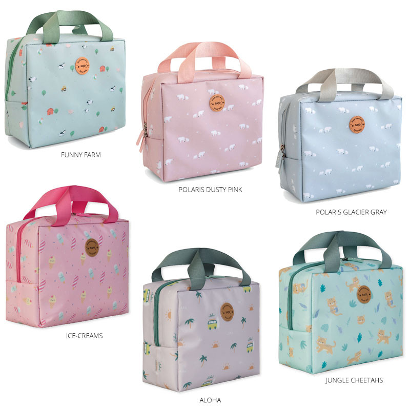 Bolsa Térmica en 6 Colores y dibujos diferentes: Verde-Granja divertida, Rosa-Osos polares, Gris-Osos polares, Verde-Guepardos jungla, Blanco-Aloha, Rosa-Helados. Gracias a su práctico diseño, podrás aprovechar al máximo su espacio interior para llevar todos los alimentos bien organizados, manteniendo la temperatura de los alimentos tanto en frío (hasta 3-4 h.) como en caliente (hasta 5-6 h.)