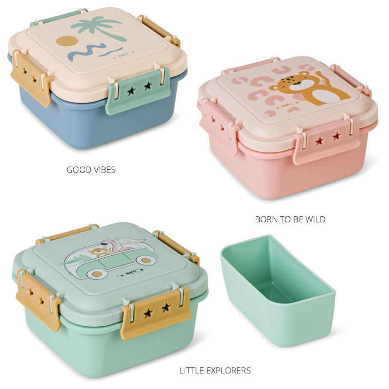 Perfecta para llevar snacks o la merienda bien organizados. Práctica cajita ideal para acompañar a los peques al cole, al parque o de excursión. Gracias a su tapa con 4 cierres de clic fáciles de usar, incluso los más pequeños podrán abrirla y cerrarla sin ayuda. En 3 colores con divertidos dibujos: Azul-Olas playa, Rosa-Huellas tigre o Verde-Furgoneta exploradores.