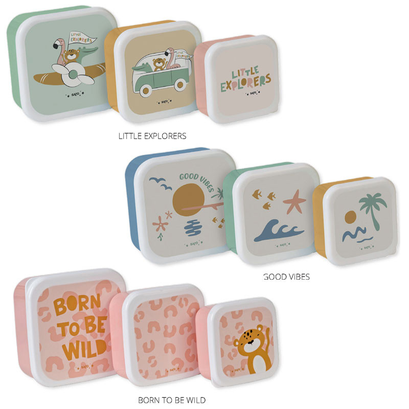 Set 3 de Cajitas perfecto para llevar el almuerzo del peque al cole o al parque. Muy prácticas y fáciles de almacenar, ya que se guardan unas dentro de otras. Con tamaño perfecto para llevarlas siempre contigo: