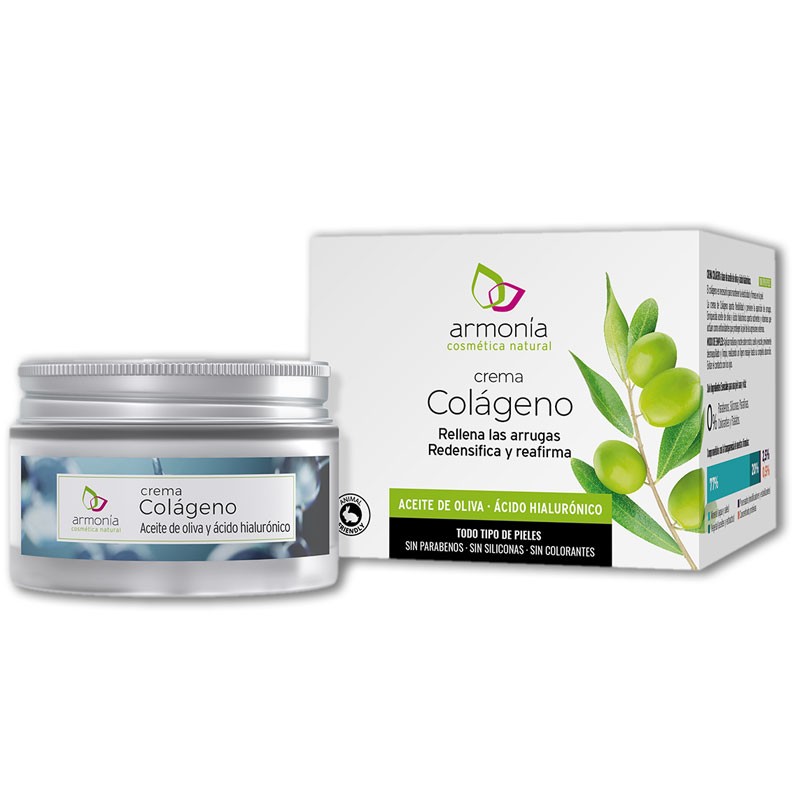 Rellena las arrugas, Redensifica y Reafirma. Todo tipo de pieles. 50ml. Crema Colágeno a base de aceite de oliva y ácido hialurónico. La crema de Colágeno aporta flexibilidad y previene la aparición de arrugas. Enriquecida con aceite de oliva y ácido hialurónico aporta nutrientes y vitaminas que actúan como antioxidantes que protegen la piel de las agresiones externas.
