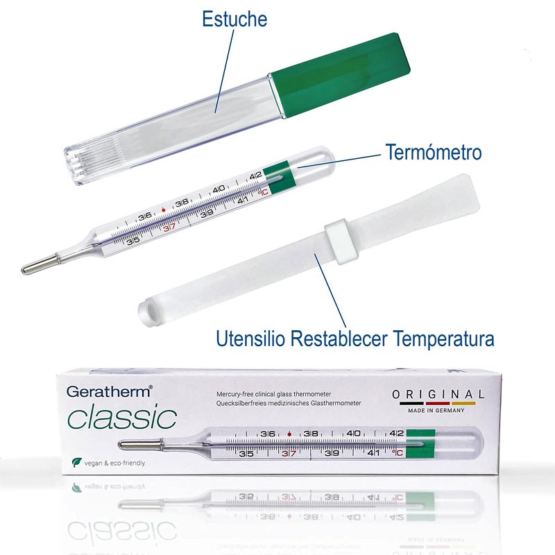 Termómetro Clínico de vidrio para medición de Temperatura Corporal. Sin Mercurio, utiliza como líquido de medición Galio, sustancia inocua y no tóxica, de altísima precisión. Rango de medición de 35,5°C a 42,0°C, garantizada por vida una alta precisión (+0.1 °C/-0.15 °C). Incluye estuche de protección y práctico utensilio de seguridad para reajuste de temperatura antes de nueva medición.