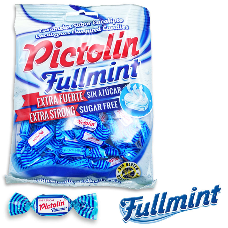 Bolsa con 65g. de Caramelos Pictolín sabor Eucalipto Extrafuerte. Despejan la garganta de forma inmediata. Solo para l@s más atrevid@s. Sin azúcares añadidos y sin gluten.