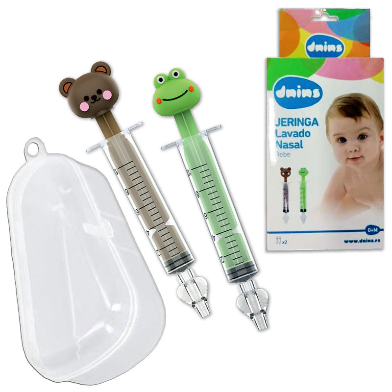Cada caja contiene una cajita de plástico para guardar las 2 jeringas con simpáticos animalitos: Osito marrón y Rana verde. Con ellas podrás enfrentar esos molestos resfriados y congestiones nasales con confianza.