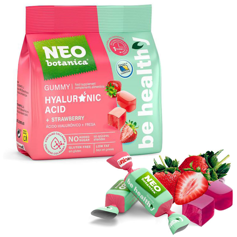 Bolsa 90g.con 10 Gummys Ácido Hialurónico + Fresa, Neo Botánica ¡estar sano! Complemento Alimenticio que contribuye a la Hidratación de la Piel. Dosis Recomendada 1 diario. INGREDIENTES: Ácido Hialurónico. Fresa y Colágeno Marino. Sin azúcares añadidos. Sin gluten. Bajo en grasas. CN. 224757.4.
