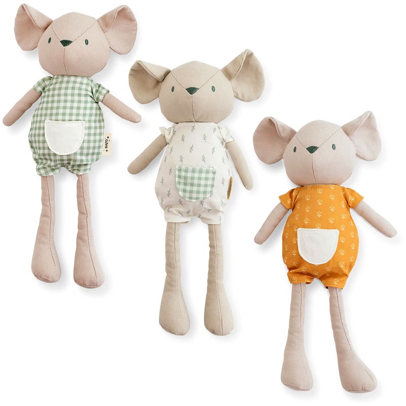 Estos 3 adorables Ratoncitos Basil-Bichi, Ginger-Mimosas y Pepper-Ocre, podrán acompañar a tu peque en sus noches de descanso y en las aventuras más divertidas. Composición: 50% poliéster y 50% algodón. 30cm. altura.