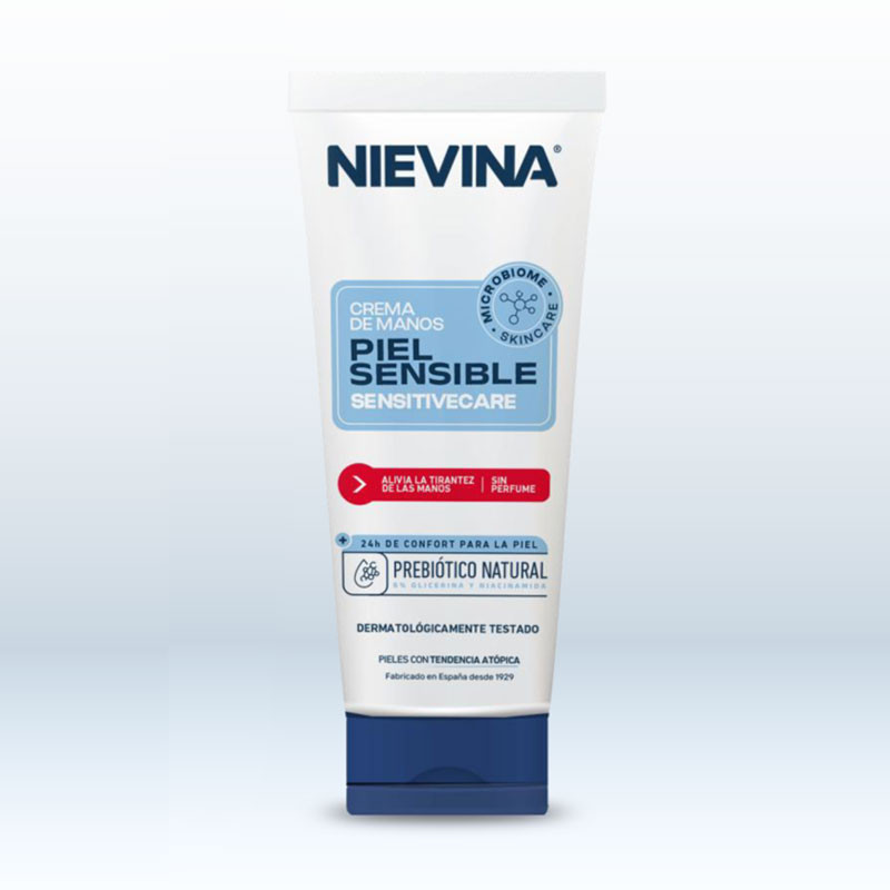 Crema Manos Sensitivecare Nievina 75ml. Para el cuidado de la piel basado en el microbioma. Alivia la tirantez de las manos. 24 horas de confort para la piel. Prebiótico Natural. Pieles con tendencia atópica. Dermatológicamente testado. O% colorantes, perfume y sulfatos. Sin crueldad animal. Vegano. Sin gluten. Fabricado en España. CONTIENE: 6% GLICERINA y NIACINAMIDA.