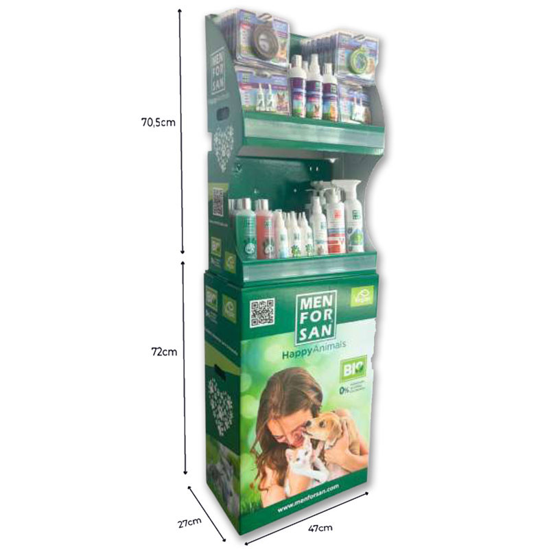 Expositor Cosmética para Mascotas con 85 Artículos Menforsan de 15 variedades diferentes. Tamaño: 47 x 27 x 142,5cm.