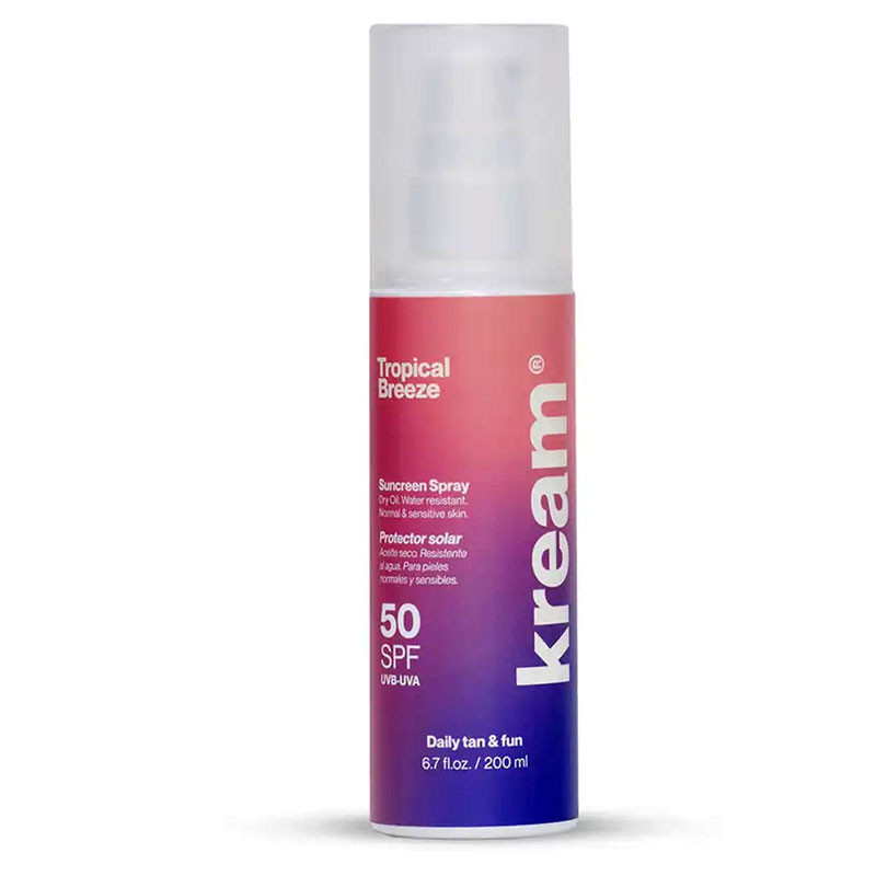 Protector Solar Tropical Breeze Kream. 200ml. de Aceite Solar. Spray con protección SPF50 que cuida tu piel por más tiempo. Disfruta de bronceado a la vez que reduces el envejecimiento cutáneo y la aparición de arrugas, te protege incluso tras 40 minutos de exposición solar. CN.216984.5