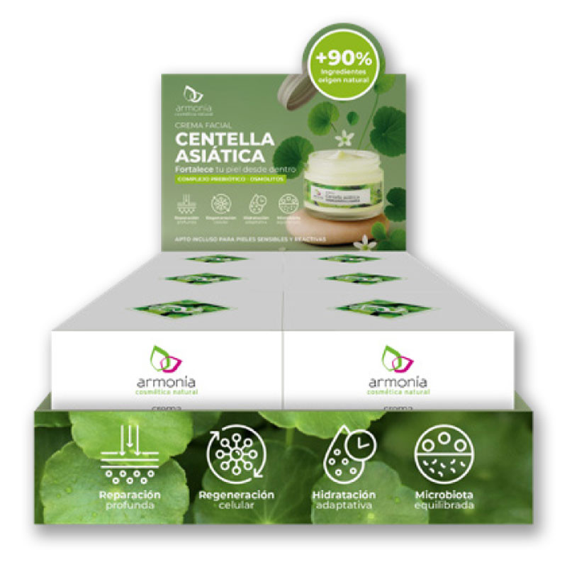 Crema CICA Centella Asiática de Armonía. 50ml. de tratamiento Cosmética Natural, especializado para pieles en estados alterados: irritación, sensibilidad, rojeces o estrés ambiental. A diferencia de una crema hidratante convencional, su formulación de triple acción aborda la regeneración celular, el equilibrio de la microbiota y la hidratación adaptativa frente a condiciones de estrés.