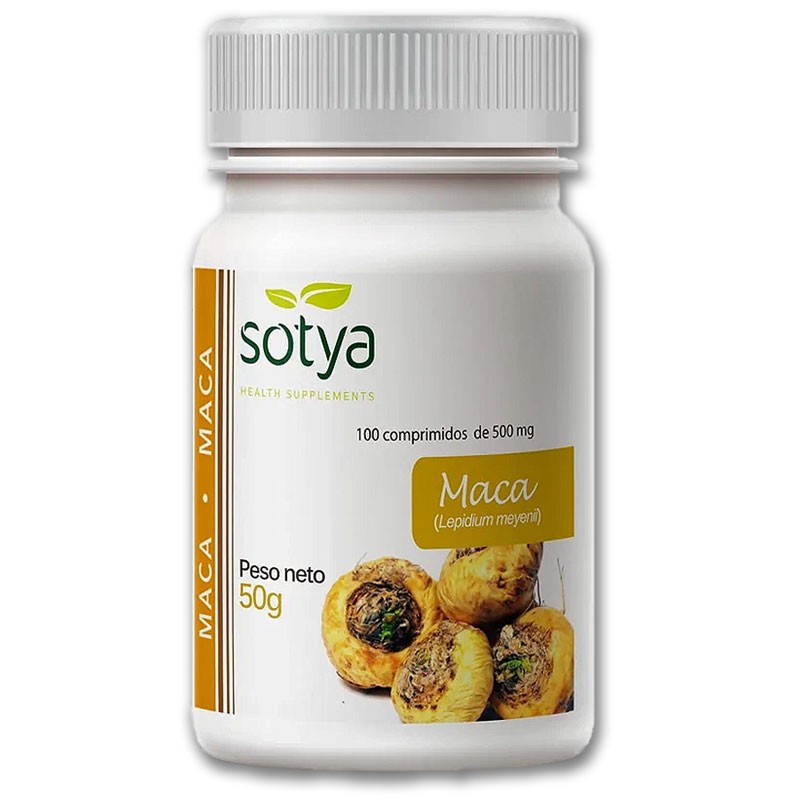 MACA de SOTYA es un Complemento Alimenticio, con 100 comprimidos de 500mg. elaborados con extracto de maca (Lepidium meyenii). La Maca es un tubérculo que se cultiva por encima de 3.400m. en los Andes Peruanos. Resistiendo condiciones extremas incluso de -20ºC. Alimento preferido de los antiguos guerreros INCAS. Tiene un gran valor nutritivo y es uno de los alimentos más completos que existen.